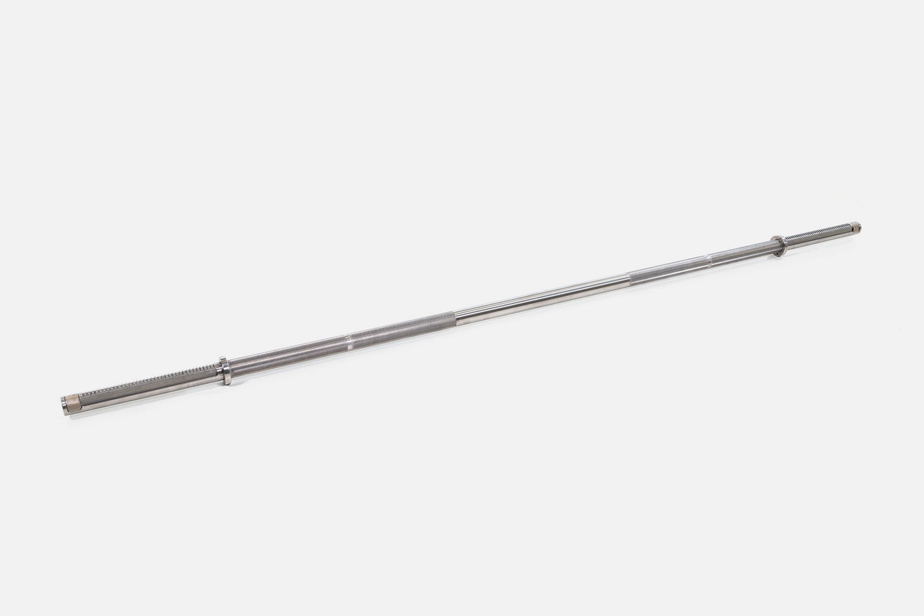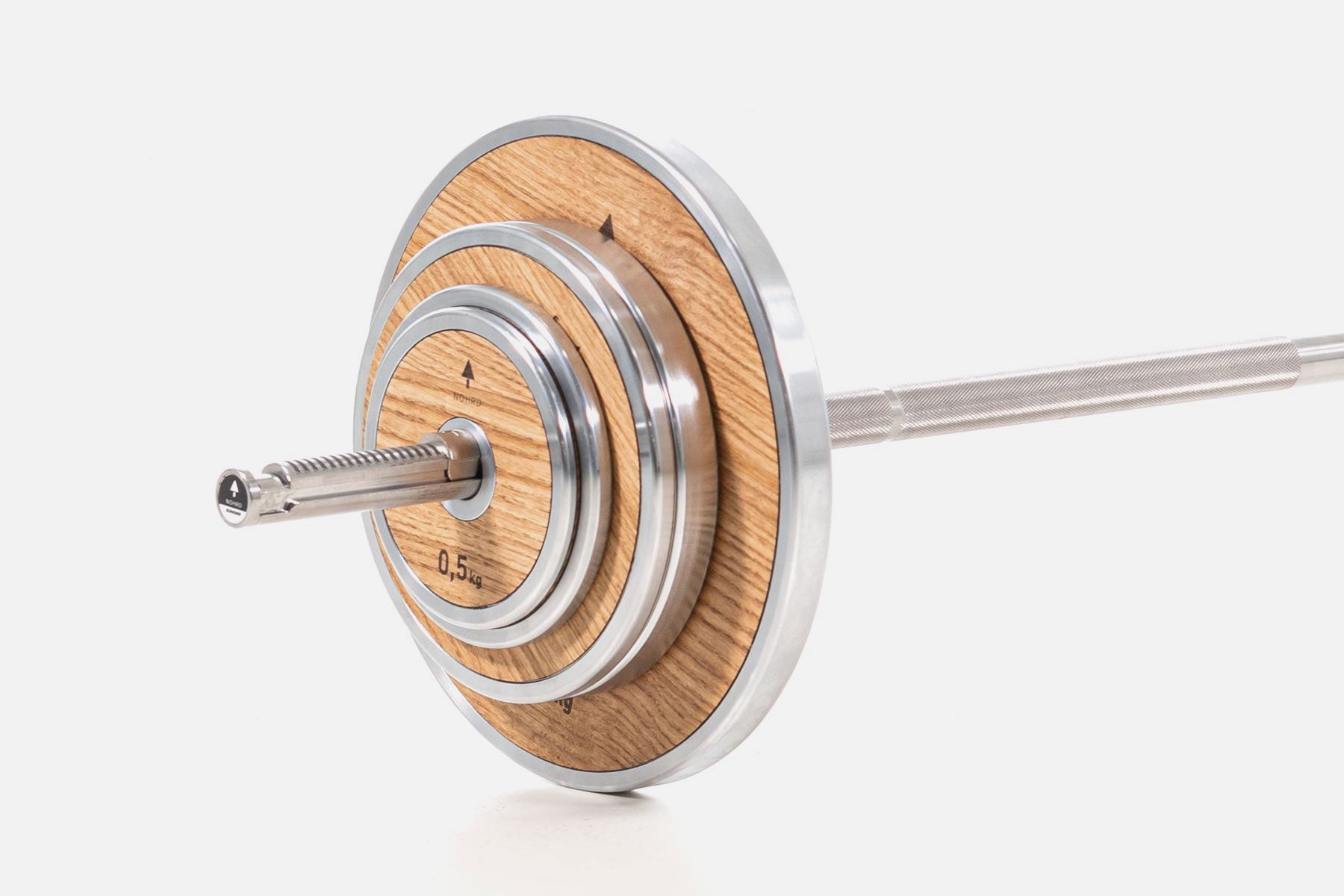 This barbell bar does not require separate disc holders, as it securely holds them in place with one movement.